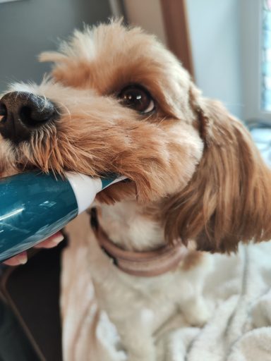 Efter schamponeringen appliceras ett professionellt balsam berikat med proteiner, aminosyror och vitaminer som stärker pälsen, återfuktar huden och ger en naturlig glans. Behandlingen avslutas med skonsam föntorkning, där jag ser till att pälsen blir helt torr och fluffig – utan stress för hunden.